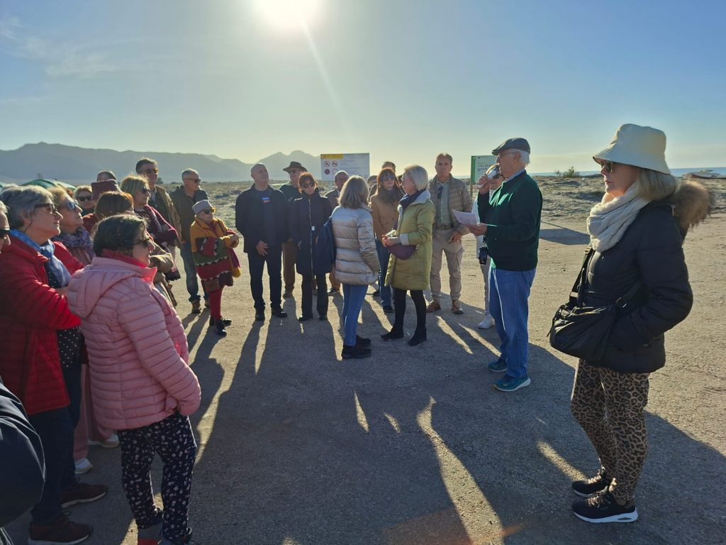 La primera parada tuvo lugar en Las Amoladeras, donde se abordó la interpretación del sistema dunar y su vegetación, así como la práctica desaparición de las dunas como consecuencia de la extracción masiva de arena en el pasado. Posteriormente, el mirador de Las Salinas permitió conocer la historia y relevancia de las salinas, así como el funcionamiento de los huertos dunares, hoy prácticamente extinguidos.