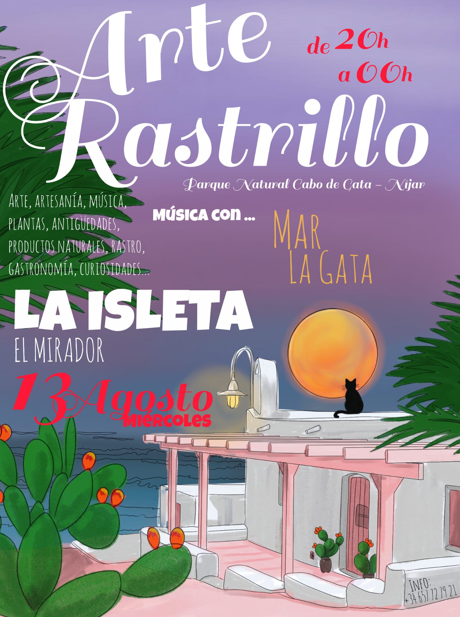 En su recorrido por las diferentes poblaciones del Parque Natural del Cabo de Gata-Níjar, Arte Rastrillo instalará este miércoles, 13 de agosto, sus puestos en el Mirador de la localidad La Isleta del Moro, en horario de 20 a 24 horas.