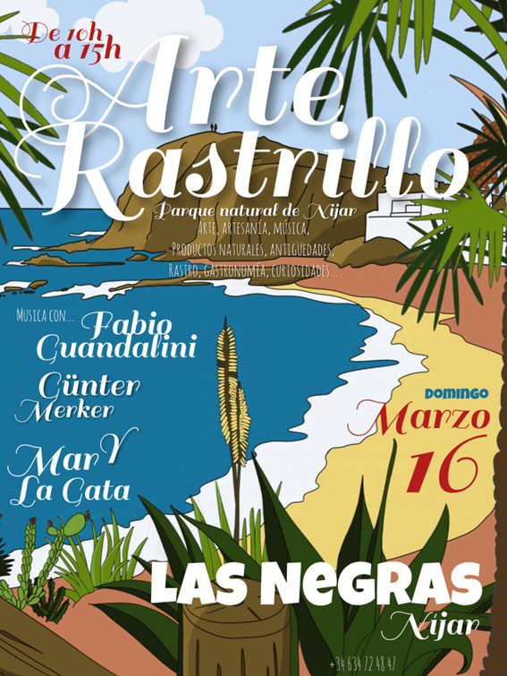 En su recorrido por el Parque Natural del Cabo de Gata, Arte Rastrillo, el popular rastrillo que transita por diferentes localidades de este maravilloso espacio natural almeriense, detiene su periplo este domingo 16 de marzo en la población de Las Negras-Níjar. Entre las 10 y 15 horas los integrantes de este colectivo de artistas mostrarán al público sus obras, antigüedades, gastronomía, productos naturales, rastro, artesanía…, en esta ocasión con las actuaciones musicales de  Fabio Guandalini, Mar La Gata y Günter Merker.