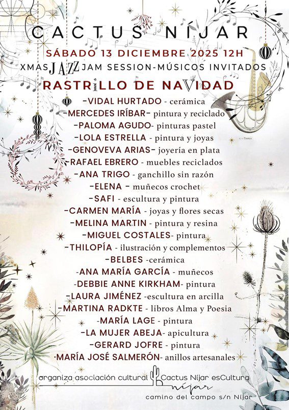 Con la presencia de más de veinte artesanos y artistas, la Asociación Cultural Cactus Níjar esCultura ha programado para el próximo sábado 13 de diciembre, a partir de las 12 horas, un rastrillo de Navidad en el que se exhibirán objetos de cerámica, pintura, joyas, muebles, muñecos, escultura, apicultura… realizados por los propios artífices presentes en la muestra.