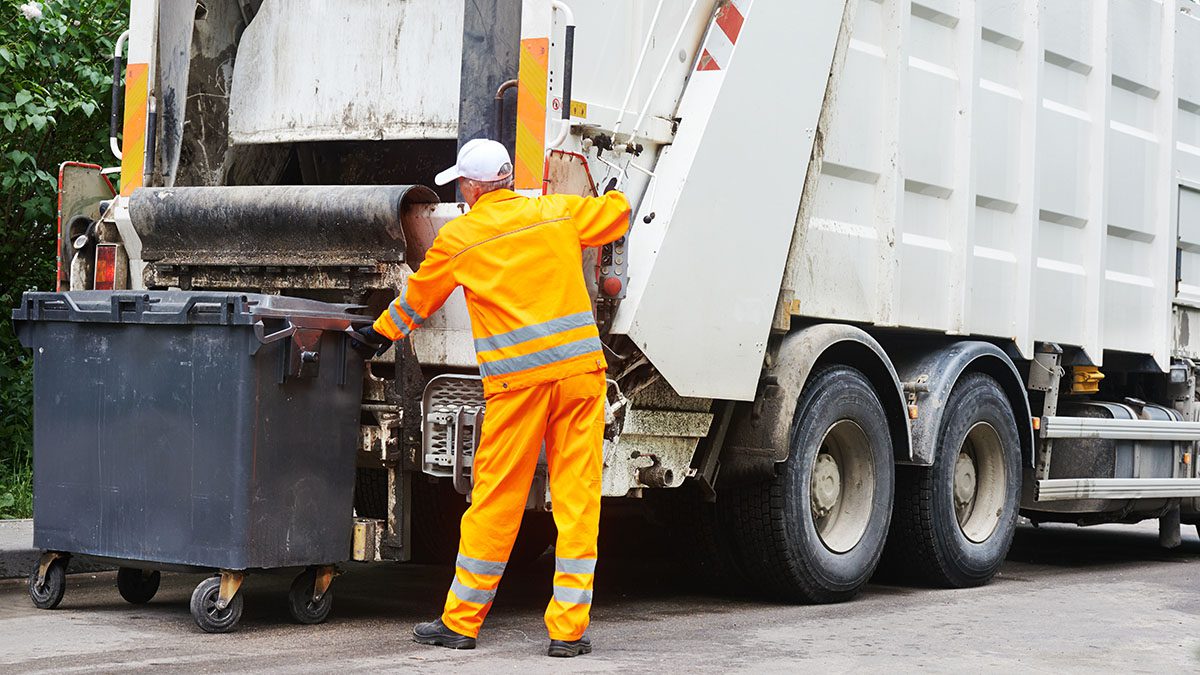 Worker of urban municipal recycling garbage collector truck loading waste and trash bin