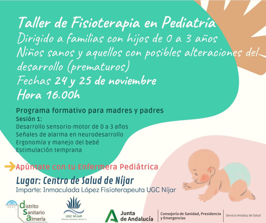 ¿Tienes un peque de 0 a 3 años? ¡Este taller está pensado para ti! Aprende sobre desarrollo sensoriomotor, señales de alarma, ergonomía y estimulación temprana de la mano de la fisioterapeuta del Centro de Salud de Níjar, Inma López.