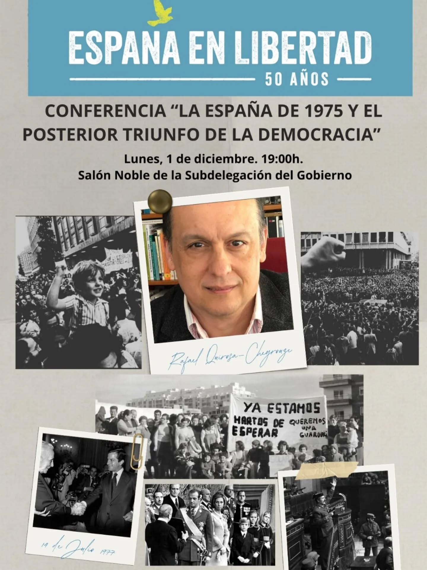 El próximo lunes, 1 de diciembre, a las 19:00h, el catedrático de Historia Contemporánea de la Universidad de Almería, Rafael Quirosa-Cheyrouze, impartirá la conferencia «La España de 1975 y el posterior triunfo de la democracia», con especial referencia a la situación que se vivía la Almería de la época.
