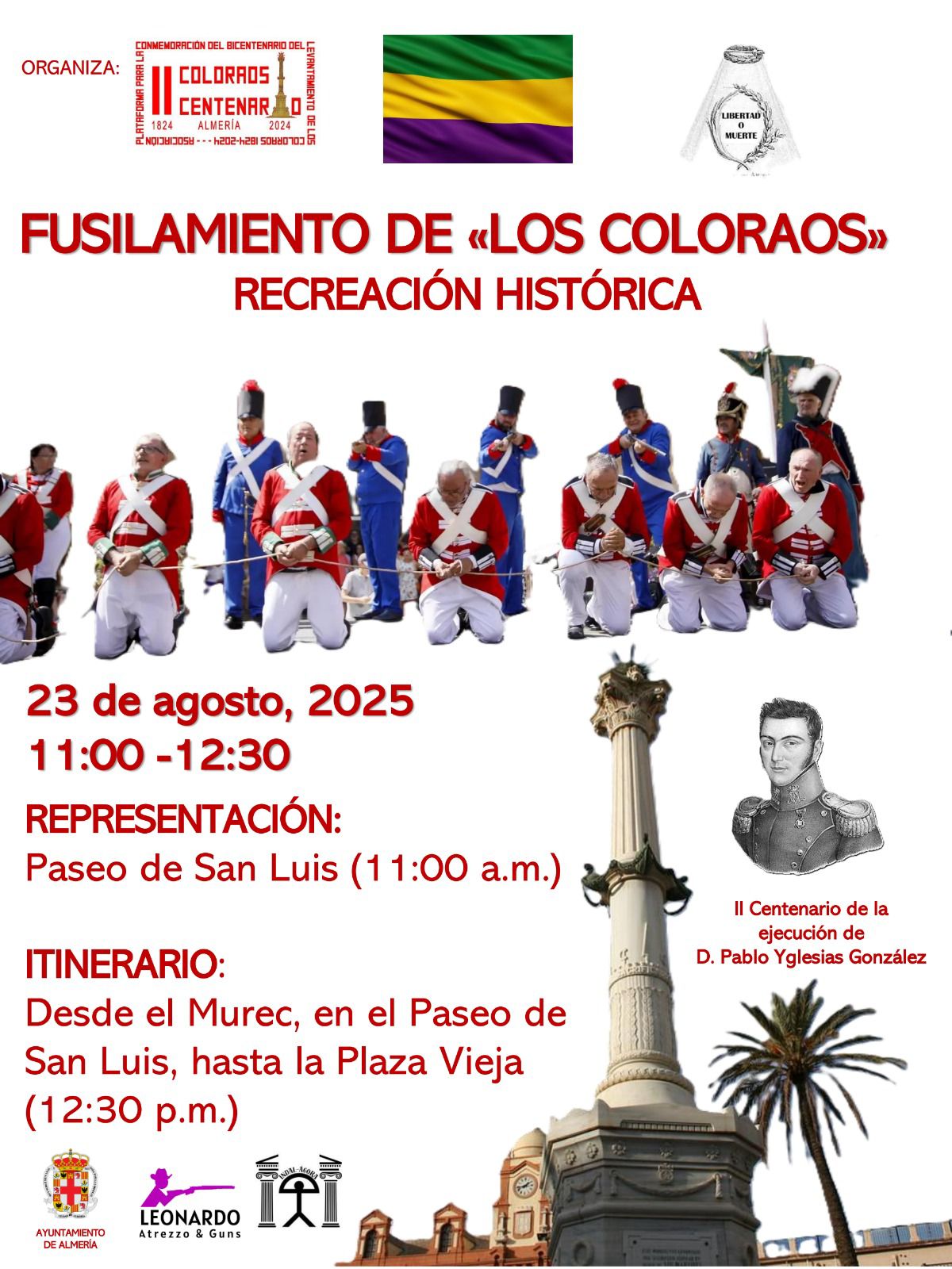 En octubre del año 1823, Fernando VII, ayudado por el ejército francés llamado “Los 100.000 hijos de San Luis”, recuperó el poder absoluto y derogó toda la legislación aprobada en el trienio liberal, mandando ahorcar al general Riego y persiguiendo a los liberales. Fue en ese momento histórico cuando un grupo de 49 voluntarios, al mando del excoronel Pablo Iglesias, embarcan en Gibraltar con destino a Almería, donde creen que cuentan con el apoyo de los liberales. Visten casacas rojas compradas al ejército inglés, de ahí el apodo popular de “los coloraos”.