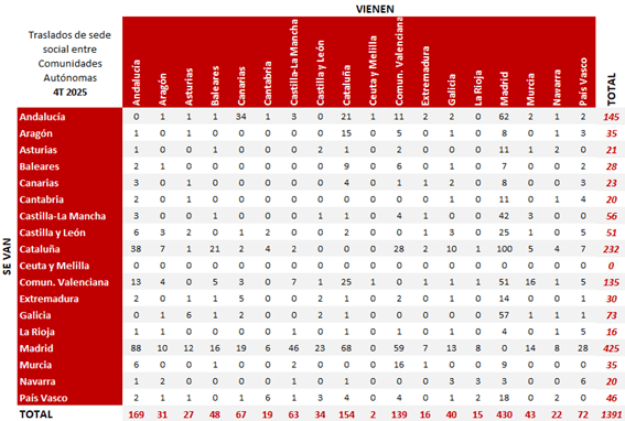 La Comunidad de Madrid concentra el mayor número de salidas de sociedades mercantiles (425), seguida de Cataluña (232), Andalucía (145) y la Comunidad Valenciana (135). Dado que esta magnitud depende del tamaño empresarial de cada territorio, el indicador más representativo es el saldo neto (entradas menos salidas). Bajo este criterio, Canarias presenta el mejor resultado (+44), seguida del País Vasco (+26) y Andalucía (+24) correspondiente a 169 entradas y 145 salidas. En el extremo opuesto, Cataluña registra el peor saldo (‑78), mientras que Galicia muestra 33 salidas netas, según datos de la Estadística Mercantil trimestral del Colegio de Registradores.