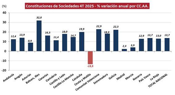 Por Comunidades Autónomas, en el cuarto trimestre de 2025, y en comparación con el mismo periodo de 2024, el número de nuevas sociedades mercantiles creadas aumentó en todos los territorios, excepto en las Ciudades Autónomas de Ceuta y Melilla; registrándose los incrementos más elevados en Illes Balears (32 %), la Comunidad Valenciana (22,9 %) y Galicia (22,3 %). En el caso de Andalucia este aumento fue del 12,4%.