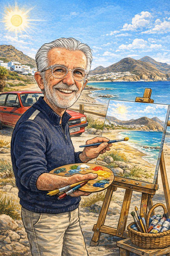 Mas no está aquí Escurín para descubrir dotes danzarinas tan señaladas, lo hace por méritos propios como pintor excelente de vocación tardía. Aun cuando en su infancia ya apuntaba maneras como dibujante, no fue hasta su jubilación cuando encontró su verdadera inclinación artística a través del carboncillo, el pastel y el óleo, para posteriormente inclinarse por la versatilidad del acrílico para sus cuadros, la técnica que ahora utiliza para la ejecución de sus obras. Una crónica visual sobresaliente de los rincones del paraje incomparable del Parque Natural de Cabo de Gata, lugares que se convierten para el artista en referencia e inspiración para sus lienzos.