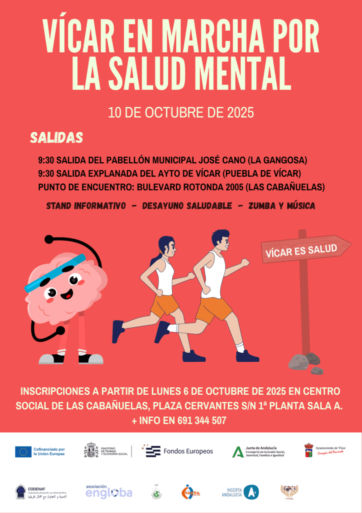 Como actividad final a esta semana de concienciación, el viernes día 10 Vícar se pone ‘en marcha por la Salud Mental’ con una caminata y jornada de convivencia a la que está llamada a participar el conjunto de la sociedad municipal. A las 09.30h los grupos saldrán desde el Pabellón José Cano en La Gangosa y desde la explanada frente al ayuntamiento en Puebla de Vícar, con punto de encuentro en el Bulevar Ciudad de Vícar junto a la rotonda del 2005. Una vez allí, los asistentes compartirán un desayuno saludable y una clase de zumba.