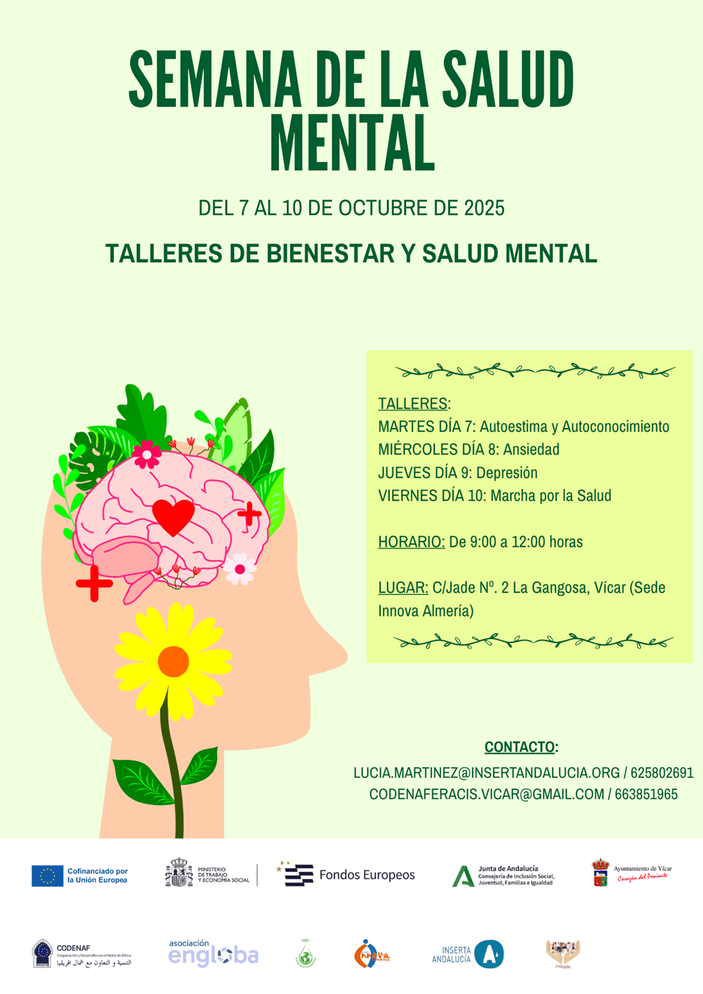 Con motivo del Día Mundial de la Salud Mental (10 de octubre) el Área de Servicios Sociales del Ayuntamiento de Vícar ha organizado toda una semana de actividades en conmemoración de tal fecha. Concretamente, entre el martes 7 y el viernes 10 se van a estar desarrollando diferentes talleres “con el objetivo de dar visibilidad y concienciar sobre algunas de las afecciones más comunes”, ha señalado el alcalde, Antonio Bonilla. Todos los talleres se impartirán en la sede de Innova situada en La Gangosa (C/ Jade, 2) de 09.00 a 12.00h.