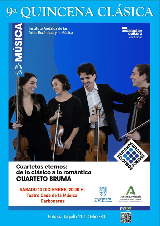 La 9ª Quincena Clásica de Carboneras continúa el próximo sábado 13 de diciembre en el Teatro Casa de la Música con el concierto Cuartetos Eternos, de los Clásico a lo Romántico, con el Cuarteto Bruma.