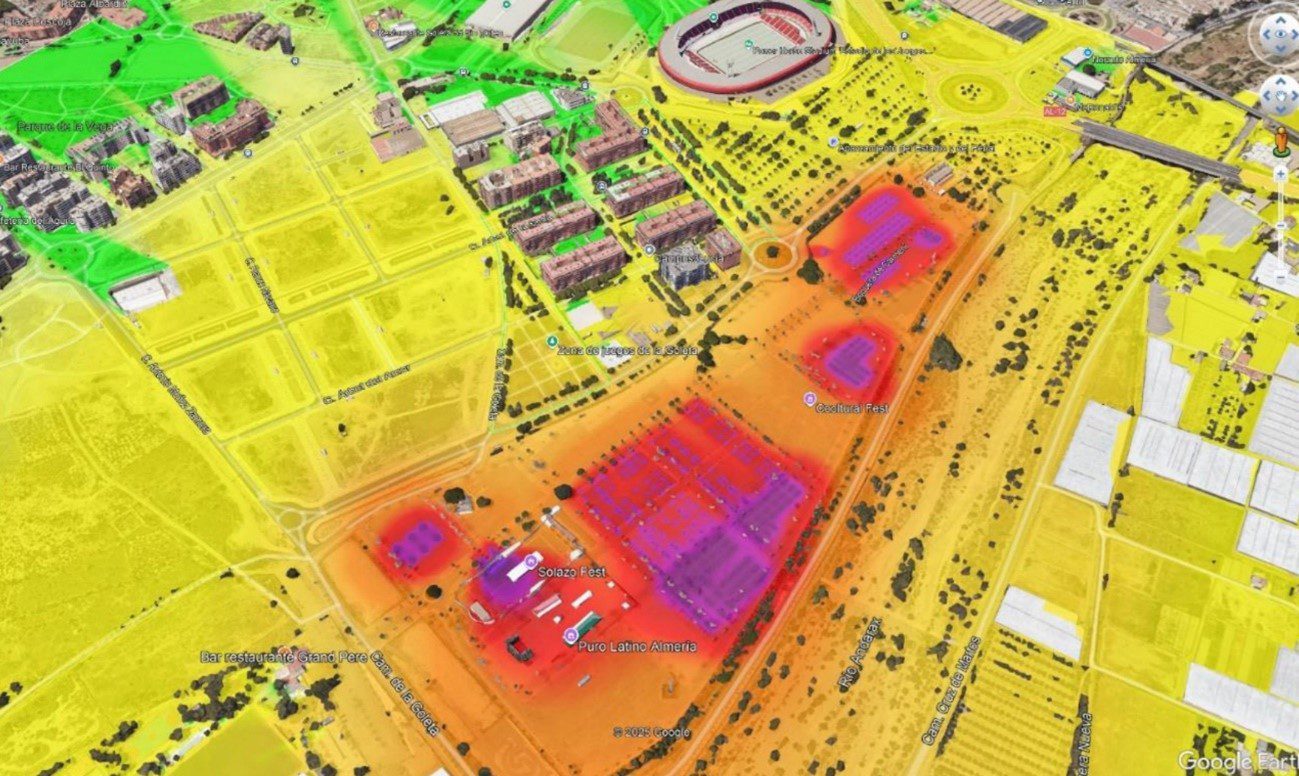 En primer lugar, se ha realizado un estudio acústico predictivo con la ayuda del software líder para el cálculo, presentación, evaluación y predicción del ruido ambiental, ‘CadnaA’. Gracias a este estudio se pudieron determinar los límites máximos de emisión que se podrán permitir durante el transcurso de la Feria. Una vez establecidos estos límites, se procede al control de estos en tiempo real.