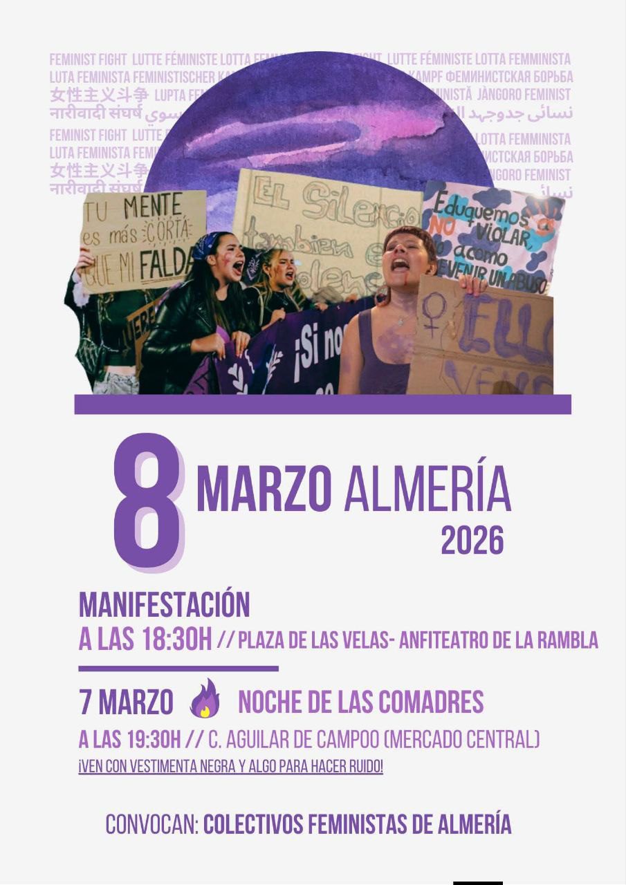 La convocatoria está impulsada por la Asamblea Feminista 8M Almería y el colectivo Nunca Más Sin Nosotras, que animan a la ciudadanía a participar en una jornada que combinará reivindicación y expresión colectiva. Así mismo, cuenta con el apoyo de la Coalición Por Andalucía, integrada por Izquierda Unida, Movimiento Sumar, Iniciativa del Pueblo Andaluz y Alternativa Republicana de Andalucía.