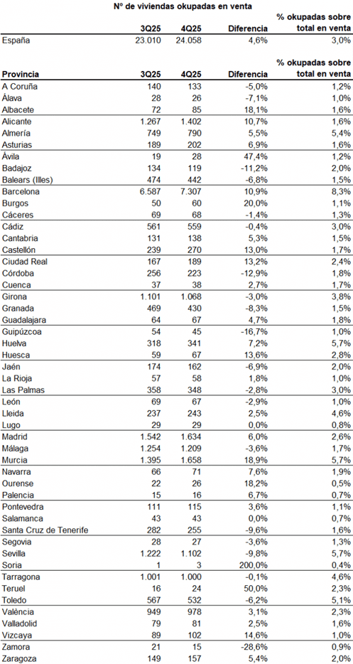 El volumen de viviendas sin posesión que se ofertan en el mercado de venta creció en España un 4,6% en un solo trimestre, según un estudio publicado por idealista basado en los inmuebles publicados en su plataforma en el último trimestre de 2025. En el último cuarto del año pasado hubo anunciadas 24.058 viviendas okupadas, frente a las 23.010 que hubo en el tercer trimestre de este año.