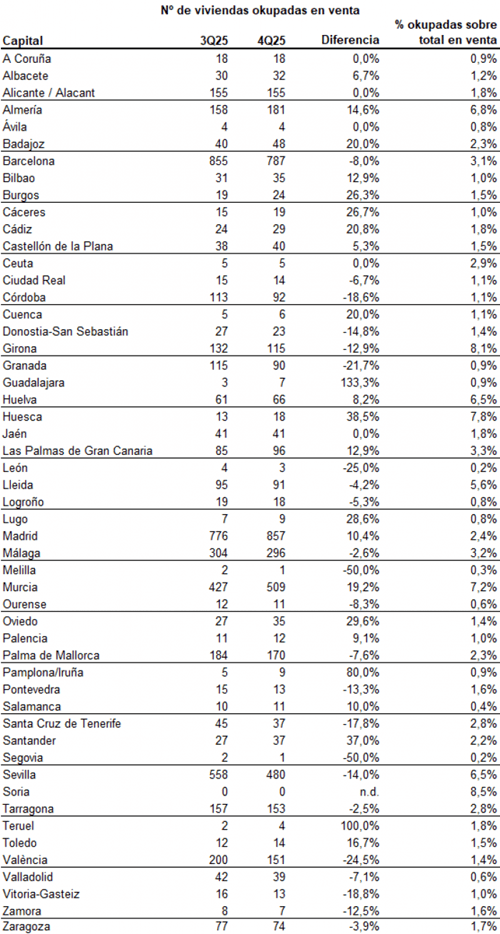 En el lado opuesto se sitúan las provincias de Soria, con apenas un 0,4% de viviendas a la venta con okupas –y ni una sola en su capital–; Ourense (0,5%), Salamanca y Palencia (0,7%), Lugo (0,8%) y Zamora (0,9%).