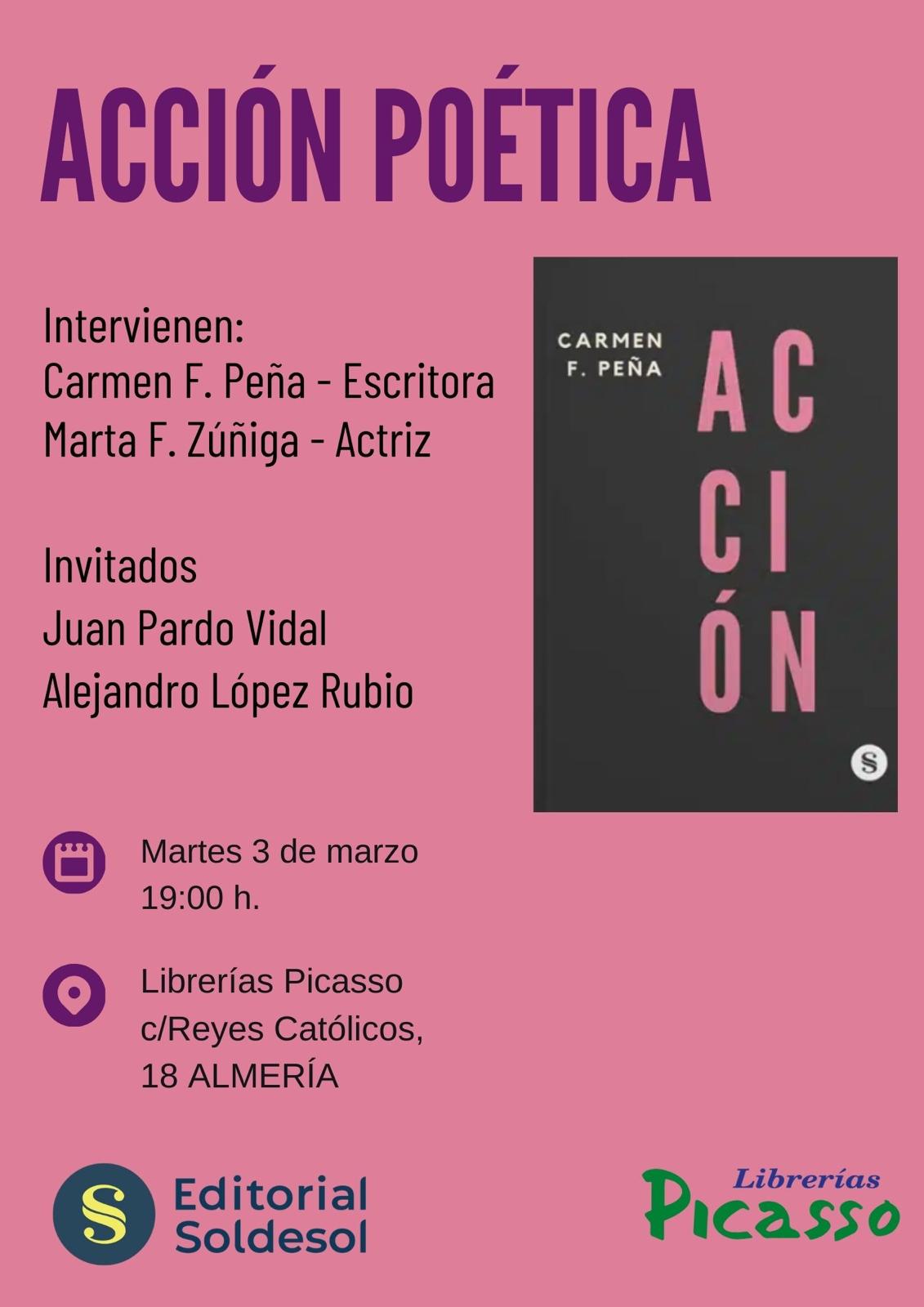 La literatura volverá a ocupar un espacio protagonista en la agenda cultural de la capital con la celebración de un nuevo encuentro en torno al libro Acción, de la escritora Carmen F. Peña, que también es la presidenta de la Asociación Vecinal de San José y El Pozo de los Frailes. La cita tendrá lugar el martes 3 de marzo, a las 19:00 horas, en Librerías Picasso, situada en la calle Reyes Católicos, 18, en pleno centro de Almería.