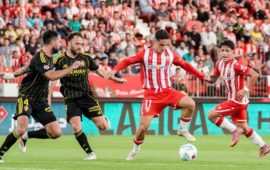 Después del homenaje al recientemente fallecido Joaquín Amérigo, periodista de Canal Sur que cubría la información del club indálico, arrancó el partido con el Almería desperdiciando la primera ocasión clara a los cuatro minutos. La presión en salida de balón del Zaragoza propiciaba el robo de Arribas, que cedía el balón para Melamed en posición idónea dentro del área, pero su disparo, mordido al primer toque, era atajado por Andrada sin mayores problemas.
