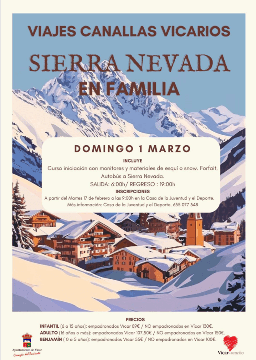 Los Viajeros Canallas Vicarios regresan este año 2026, con una nueva e interesante propuesta que consiste en una jornada en Sierra Nevada pensada para las familias. La actividad tendrá lugar el próximo 1 de marzo y en ella se incluye el traslado en autobús hasta la estación de esquí de Sierra Nevada, el forfait y un curso de iniciación al esquí o snow con materiales y monitores. La salida tendrá lugar a las 6.00 horas de la mañana y el regreso está previsto para las 19.00 horas.