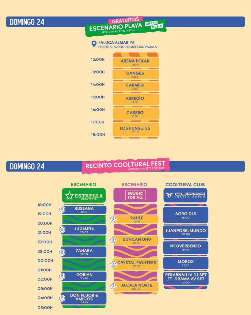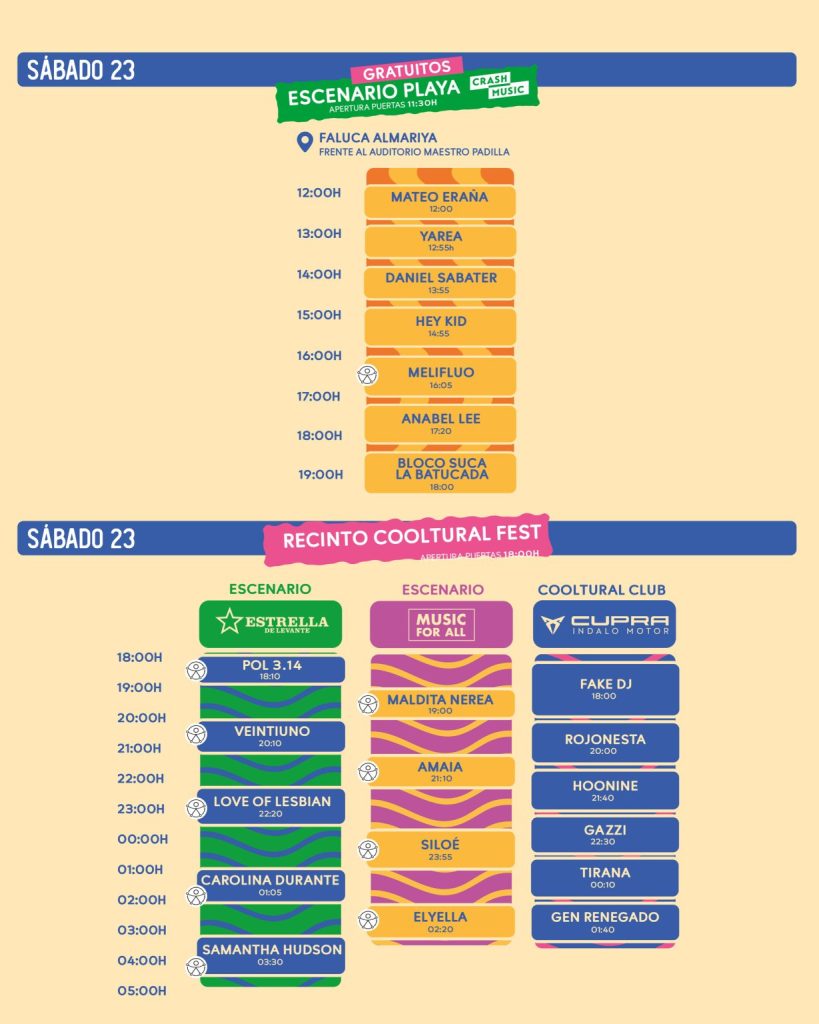 La organización ha dado a conocer hace unos días los horarios de actuación de una edición de Cooltural Fest que volverá a tener una amplia programación de entrada libre y gratuita, como la propia fiesta de bienvenida del día 21 como las dos jornadas matinales en la Faluca, junto al Auditorio Municipal Maestro Padilla el sábado 23 y el domingo, 24 de agosto, y tres jornadas completas ‘de entrada o abono’ en el Recinto de Conciertos del Ferial, el viernes 22, sábado 23 y domingo, día 24.