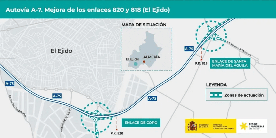 El Ministerio de Transportes y Movilidad Sostenible ha adjudicado por 14,3 millones de euros (IVA incluido) el contrato de obras para la mejora de los enlaces de Copo y Santa María del Águila en la A-7, situados en los kilómetros 820 y 818 respectivamente (antes enlaces 409 y 411) de la autovía A-7 del Mediterráneo, en el término municipal de El Ejido, en la provincia de Almería.